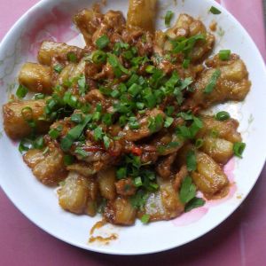 加油热锅,先放入干辣椒、肉末、蒜末爆炒,然后加入茄子与调料翻炒3~5分钟