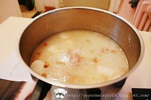然后再在锅内加水烧开放入猪蹄,加入当归、山药,用旺火烧开,改用文火煮至猪蹄熟烂。