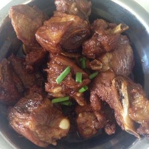 然后倒点海天酱油加凉水,淹没排骨盖上盖子熬干时加点鸡精和糖。