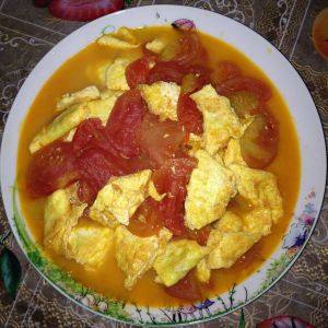 西红柿用热水去皮,切成厚片备用。锅烧干加油烧热,加入西红柿翻炒,翻炒两遍后加入鸡蛋继续翻炒两遍加入适量水中火闷3分钟,加入盐、鸡精装盘出锅。