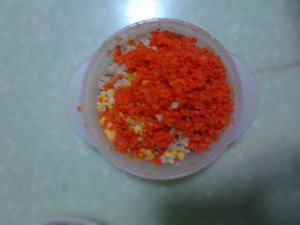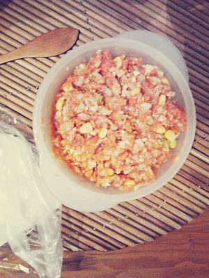 将胡萝卜、马蹄、葱都切成稍大一点的末,与玉米粒一起放入肉馅中。我是先将胡萝卜擦成丝之后才切的,这样会更细。玉米粒我用的是已经煮熟的美国甜玉米,没有切成小丁,这样口感更好。