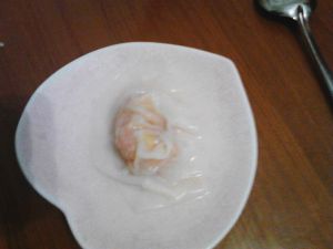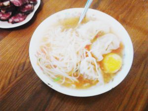将云吞捞出,在煮面,将面捞出,再浇上鸡汤,云吞见就完成了。因为之前只用蛋清,剩下了一个蛋黄,就一起住在里面。像小太阳一样,还挺可爱的。