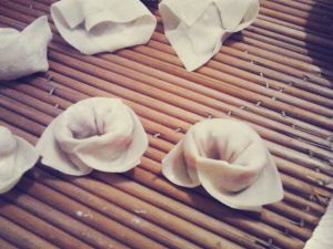 包云吞。我用的是北方的元宝式,其它还有莲花式,广式包法等等,很多网站有介绍,我就不具体写在这里了。