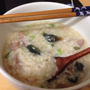 粥变稠加肉 五花肉先用生抽 糖 香油 白胡椒粉腌制15分钟 将肉放入粥内烫熟