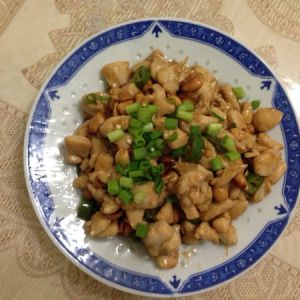 鸡丁炒至变色后到入炸好的花生米、生抽、料酒、醋、糖、鸡精及水淀粉翻炒。