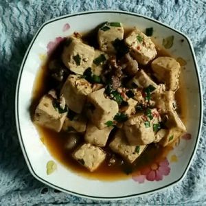 加入盐(可少放点,辣椒酱中有盐),把盐拌匀。然后加辣椒酱搅匀,加入水没过豆腐块,盖住将水煮至七分干。分别加入胡椒粉,酱油,生粉,装盘撒上葱花,完成!