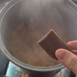 水滚了之后把土豆和胡萝卜用铲子压成泥继续煮,当水变成糊糊液体时、土豆的淀粉就产生作用了,让汤都收汁之后放咖喱块、待咖喱块完全溶解!