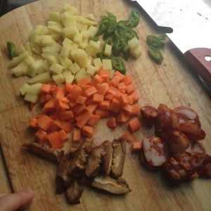 将土豆,胡萝卜,花菇以及青椒切成丁,香肠切成小片。