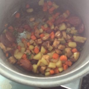 加入油,把材料放入锅中炒一下,放一点盐和味精。因为我用的速溶咖喱块,里面味道都是做好了。然后加入水,把材料都煮好!