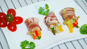 烤箱预热5分钟,将培根卷送入200度烤箱烤20分钟即可。