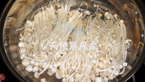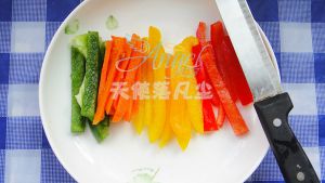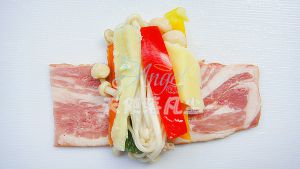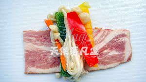 平铺培根,放上金针菇、彩椒丝、胡萝卜丝。