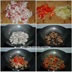 热锅上油,油热后下姜蒜丝爆锅,然后下五花肉片炒至出油且表面微黄。