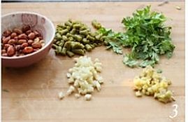 大蒜、生姜切末,酸豆角切小丁,香菜切小段;