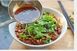 将酸豆角、花生米、香菜叶撒在表面,最后浇上汤汁即可。
