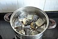 阴干草鱼,切成块,放入蒸锅里蒸熟(蒸时鱼皮朝上),取出晾冷。