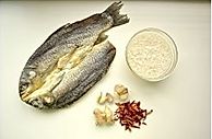 清洗咸草鱼干,用刷子轻轻刷去表面的盐粒,然后用清水浸泡1个半小时(一为去掉咸味;二可以把咸草鱼干里的一些脏物泡出来),中途换换水,尝尝咸淡,不能泡太久,否则鱼肉味道会变淡、肉质纹理变软散,不利腌制。