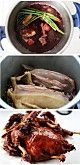 待汤汁剩100克左右时,将鸭子捞出盛入盘内,待其自然冷却后暂块装盆即成。