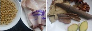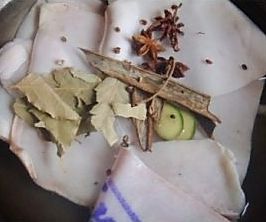 锅内放水后加入清理干净的猪皮,加入八角,桂皮,香叶,生姜,花椒一起煮