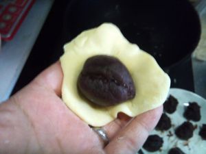 像包月饼一样包制,皮捏的时候最好中间厚,边上薄,然后捏好后滚一滚圆.