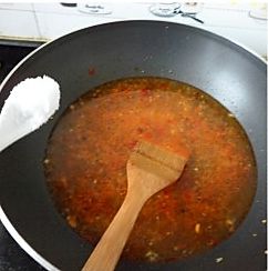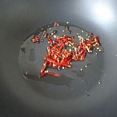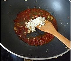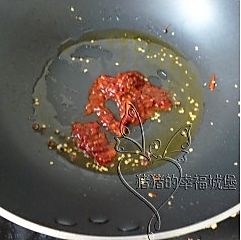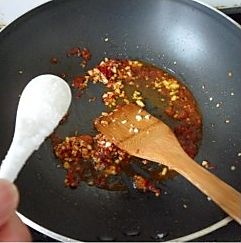 在炒辣椒的油里放入郫县豆瓣酱小火翻炒