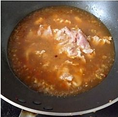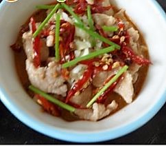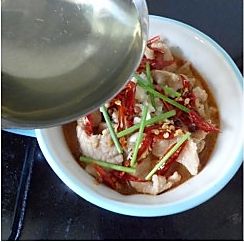 浇在放了蒜泥、香葱的肉片上,可以出锅了!