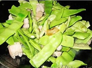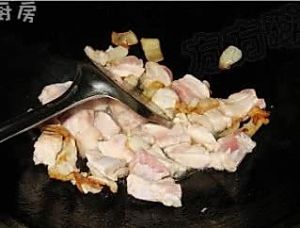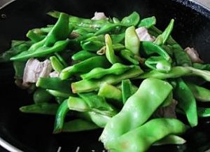 先把肥肉下热锅里炸出油,然后下五花肉煸炒,待肉变色后下豆角。