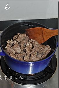 倒入焯水沥干的牛腩块,中大火不断翻炒两分钟左右。