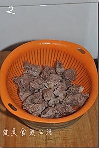 牛腩切成小块,用流动的水反复冲洗干净,至无血水渗出。锅中水烧开,冷水入锅,烧开后再煮两分钟(不要盖盖子)。捞出,用水冲洗干净沥干备用。