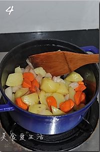 锅子烧热,倒入油,油热倒入步骤3的蔬菜块,保持中火不断翻炒至胡萝卜和土豆表面收紧边缘有些焦黄,盛出备用。