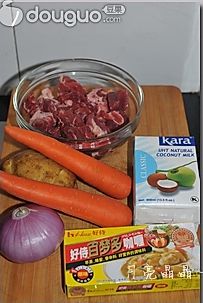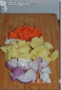 胡萝卜、土豆洗净去皮切成小块,洋葱剥去表皮,切块。