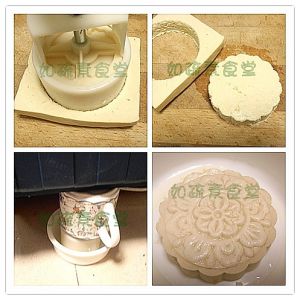 花边豆腐微波至热,重入月饼模中,并将月饼模放在一只碗中,再用合适的杯扣在模具上面按压的部位,然后在杯上压上重物;这个过程是为了将热豆腐重新整形按压出花纹。注意:要保证整体安全稳固哦~~
