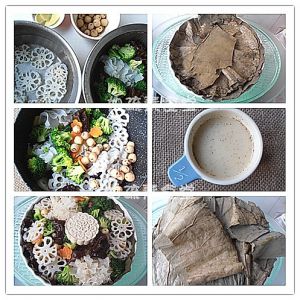 盖上另一半荷叶,旺气再稍蒸片刻至荷叶出香味停火取出去除上面的荷叶即可。