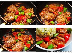 最后加入青红椒或其他配菜的蔬菜,用余汁煎炒,大火收汁并给蔬菜断生,取出鸡肉切条即可。