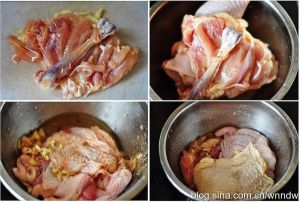 鸡肉去骨,剪断一些筋,用叉子在鸡皮扎几下,然后撒少许的盐,料酒,酱油,五香粉,加入姜末,拌匀,腌制20分钟或更久;