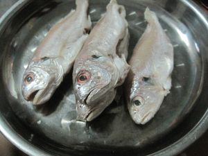 黄花鱼去除肚子、鱼鳞,洗净,沥去多余水份,加适量盐腌制一会