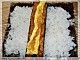 同样的法子,把剩下的四条海苔小条都卷成小筒,放旁边备用。然后另取一整张海苔,上面铺一层拌好的白寿司米饭,同时把事先煎好的鸡蛋皮卷放在手边备用。
