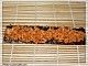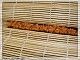 把剪开的海苔小条平铺在寿司帘上,上面铺一薄层辣酱米饭。