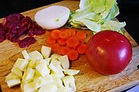 洋葱切丁,胡萝卜切片,洋白菜手撕成小块,土豆切小块,大蒜切片。