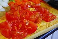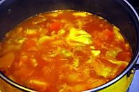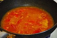 炒锅中倒入少许油烧热,放入西红柿块儿,再倒入番茄沙司,中火炒片刻后倒入一碗水,大火煮开后继续煮5分钟后,一起倒入汤锅中。