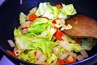 另开火,炒锅里油烧5成热,放入洋葱丁和蒜片,炒出香味后,放入胡萝卜,洋白菜和土豆继续炒3分钟左右,关火。