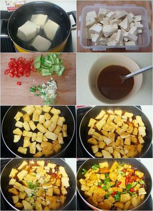 锅内放油烧至5层热时,放入豆腐小火慢慢煎至两面金黄色。