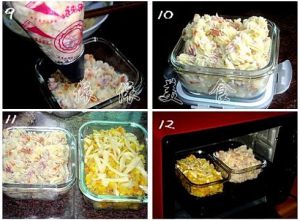 10、把土豆泥用裱花嘴裱在耐热容器的土豆泥上面;