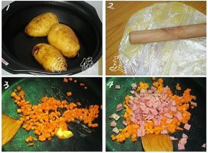 1、土豆清洗干净,划十字花刀,放进锅里煮熟,放凉后剥皮;胡萝卜削皮后切碎,火腿片也切碎;
