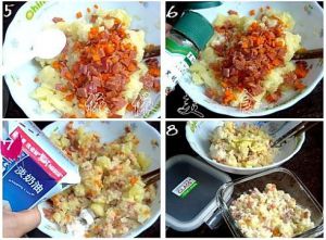 5、把炒熟的胡萝卜碎、火腿碎倒入土豆泥中,加入盐;