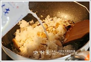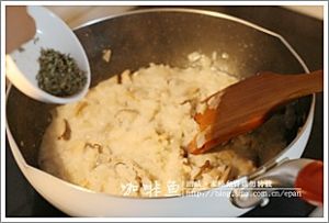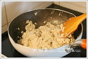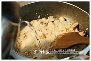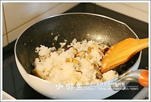 拌匀后,小火煮5分钟左右至米饭的水分收干即可;