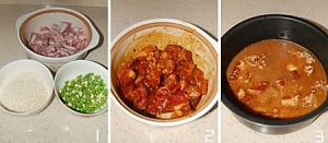 腌过的排骨和洗净的米入电饭煲,加水后煮(可以比平时煮饭时少加一些水,我觉得这样的米饭稍硬些才好吃,不过我家有小朋友,所以我还是煮的比较软)