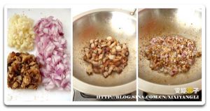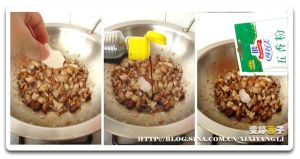 放入香菇丁,洋葱丁,蒜末一同炒香。烹入少量的米酒或花雕。