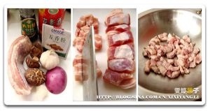 将香菇泡发后切丁,洋葱切丁,蒜瓣切丁。备用。
