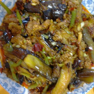 留一点点底油'下肉末'葱花姜翻炒'加一勺豆瓣酱'下茄条'加入调味品后不停翻炒'出锅前放入青椒丝'再炒几下'最后放入葱末蒜末'小焖一会'出锅