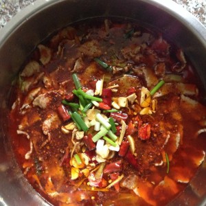 油加热放入蒜姜炒香,(我是在超市买的水煮肉片调料,可以用豆瓣代替)加入豆瓣炒香,加水,水快开时少加些盐,鸡精。水开后,将腌制好的肉片全部放入,边煮边用筷子将肉片划开,一分钟后观火,倒入盛菜的小盆中,面上撒辣椒面(根自己口味定)